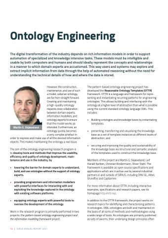 The aim of the ontology engineering research program is to develop tools and methods that improve the usability, efficiency and quality of ontology development, main- tenance and use in the industry, by