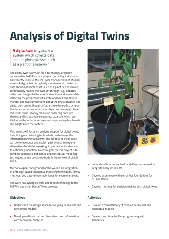 This project will focus on analysis support for digital twins, by building or combining tools which can leverage the information layer into insights. The purpose of these tools can be to reproduce and explain past events, to explore alternatives for decision making, to prepare for incidents or to optimize production. A central goal for this project is to combine semantics, behavioral and conceptual modelling techniques, and analysis methods in the context of digital twins.