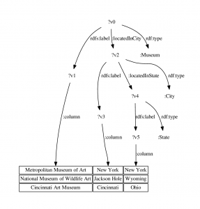 Basil Ell and his colleagues are developing an approach for automated table understanding that we sketch here. Given a knowledge graph as background knowledge and a table, we create a hypothesis graph for each row as follows: for each cell, each entity that the value in the cell might refer to is added to the (initially empty) hypothesis graph. For each two entities mentioned in a row we add all relations between those entities that we are aware of according to our knowledge graph to the hypothesis graph. Given the set of hypothesis graphs we created for a table, we perform frequent subgraph mining to identify the commonalities of the hypothesis graphs. The result for our table might be the RDF graph pattern that is shown in the following Figure where the meaning of columns is described. For example, it expressed that for each row there is a thing that is a museum and that has a name that appears in the first column.
