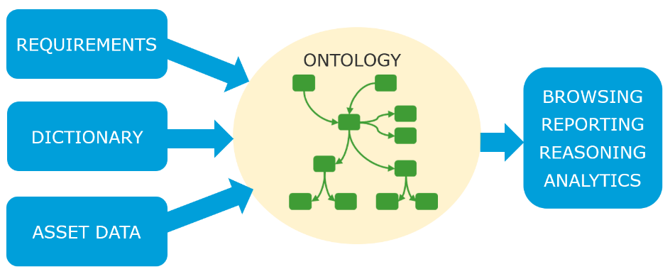 DNV GL spends about 5% of its revenue on research, innovation and business development. In 2018 the DREAM (Digital REquirements and Assurance Management) project was sponsored by an internal research programme. This project investigated how concepts, methodology and tools developed by a joint SIRIUS and NORSOK Z-TI initiative in 2017 could be applied for full digitalization and management of DNV GL’s portfolio of requirements. Close cooperation with SIRIUS was initiated. Methods, tools and demonstrators were further developed for testing based on real use cases in the maritime, oil & gas and energy sectors. We worked with domain specialists from each sector to select, review and test selected sets of requirements and represent them in a new format that allows computers to perform automated reasoning. In this way, we can check automatically if requirements are met, how they related to data about a project and whether they are consistent. This digital format also allows storage and sharing of requirements in data bases. This initial work was promising and has resulted in the DREAM tool: a framework for representing requirements in a fully digital form. The principle behind this tool is shown in the following figure. Relevant requirements, asset data and definitions are all implemented in a knowledge model – an ontology. This representation, stored in a suitable database, allows computer programs to browse, evaluated, validated and analyse requirements with a precision that is impossible with paper documents.