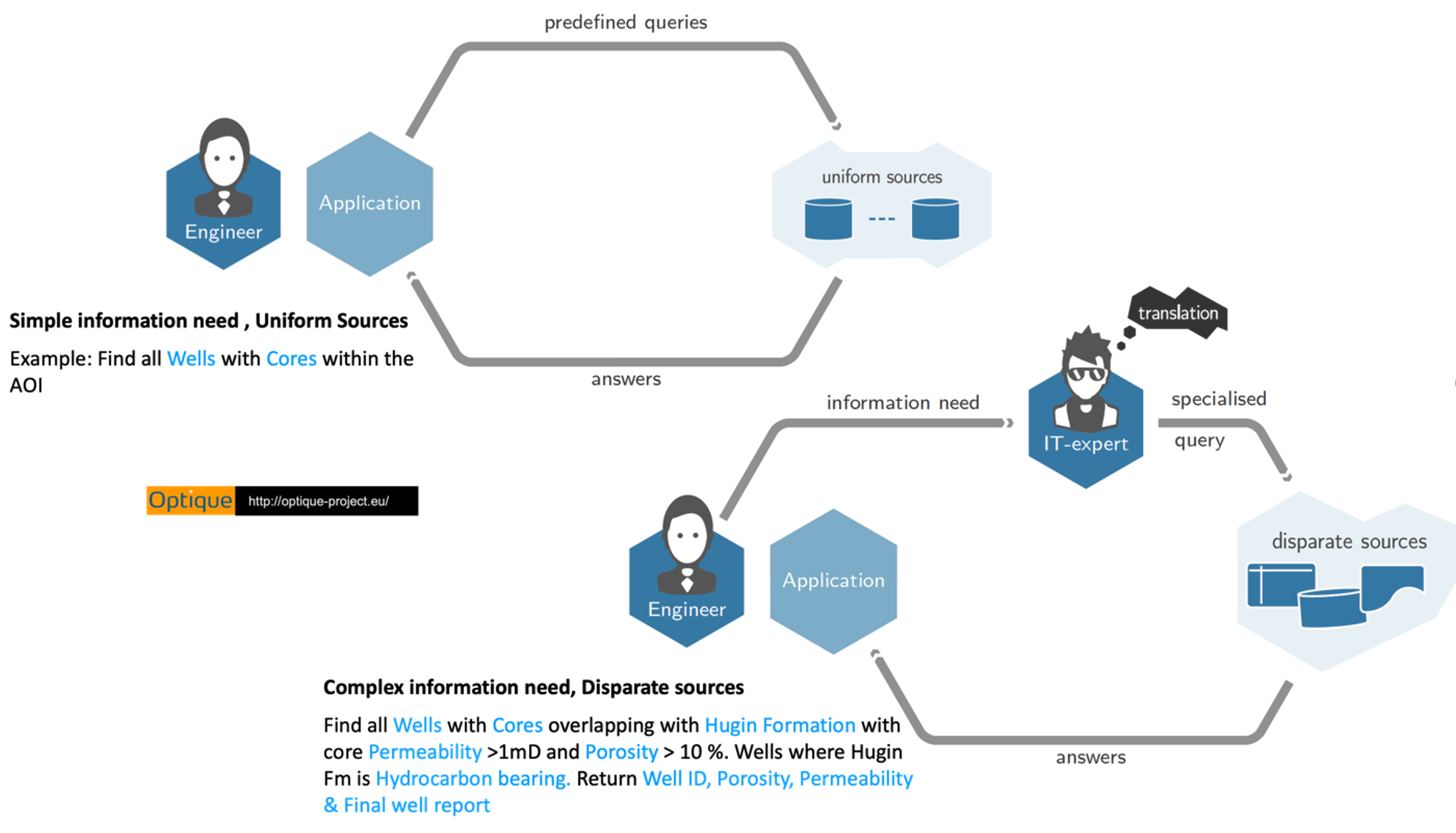 Viewed from the Geoscientist, it is hard to get an overview of all available data related to an area of interest, as this data is spread over different applications and many internal and external data sources. No unified view is, as a rule, available up front, though Project Data Managers (PDMs) assist. It is difficult to extract data from databases; should complex queries have to be written, Central Data Managers (CDMs) typically assist. It is challenging to extract data and information based on geological and petrophysical attributes (see the user scenario example below) as it is not possible to execute these types of queries simultaneously on multiple data sources. It is challenging to integrate datasets before analysis can start: this is often tedious manual work that the geoscientists must do themselves. It is incredibly difficult to extract data and knowledge from the text documents as there are very few tools that can deal with the contents of unstructured documents and reports. Geoscientists are well aware of the limitations of the workflow. As a result, valuable analyses on data are too often not performed, and possibilities in data are too often not detected.