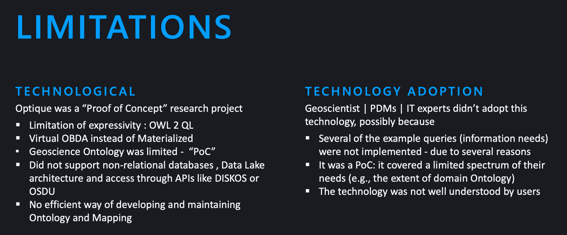 Optique showed the potential to transform the way data is gathered and analyzed by streamlining the workflow and making it more user-friendly. However, Optique has also revealed shortcomings that impede the realization of its full potential: (i) limitation to relational databases, (ii) lack of built-in support for quantitative analytics, (iii) lack of access to unstructured data, and (iv) limited tool support for constructing and maintaining the necessary ontology and mappings.