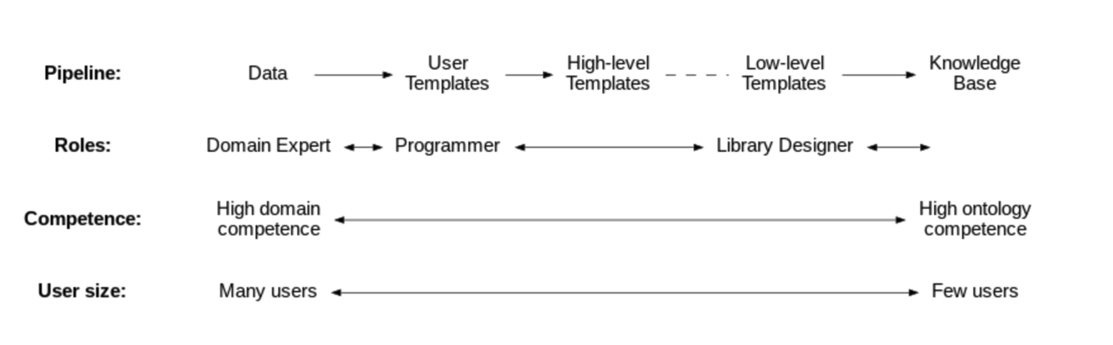 We have yet to properly specify and formally evaluate a tool-supported methodology for the development and maintenance of knowledge bases using OTTR templates. However, we believe the abstraction mechanism that OTTR templates provide can work in a similar manner as application programming interfaces (APIs) work for programming and software engineering. We anticipate the following roles for such a methodology: